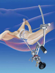 Der operative Eingriff selbst erfolgt in Rückenlage auf einem Extensionstisch (Strecktisch), da phasenweise am Bein „gezogen“ werden muss, um bestimmte Gelenkanteile einsehen zu können. Mit einer speziellen Kamera und Spezial-Instrumenten wird der Eingriff über winzige Hautschnitte minimalinvasiv in „Schlüssellochtechnik“ durchgeführt.